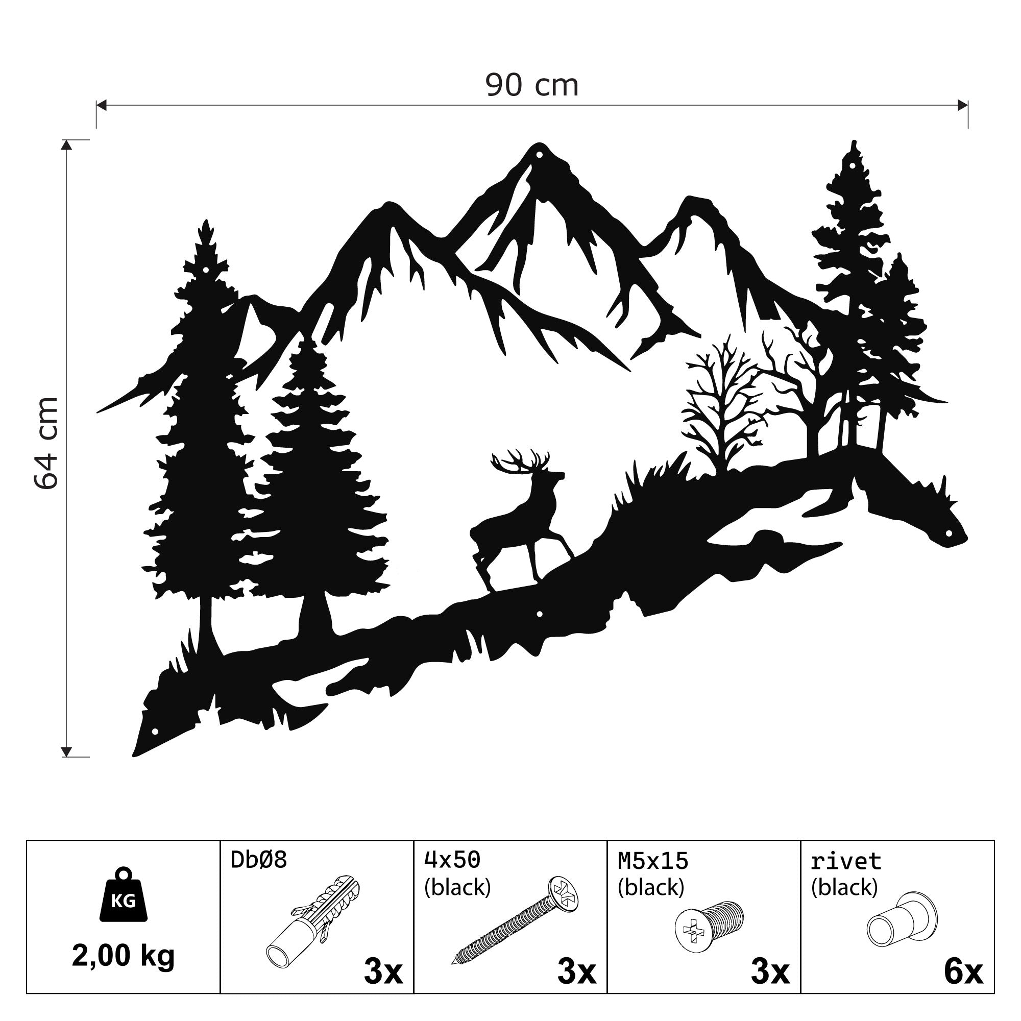 Deze metalen wanddecoratie brengt de schoonheid van de natuur in je huis. Het serene ontwerp, met een majestueus bergsilhouet en een vrij rondlopend hert, creëert een rustgevende sfeer. De fijn bewerkte boomfiguren omarmen de natuur en zorgen voor een harmonieus geheel. Door de moderne textuur van het metaal en het minimalistische ontwerp ontstaat er een dynamisch spel van licht en schaduw, waardoor je leefruimte een verfijnd en natuur geïnspireerd thema krijgt. Dit kunstwerk is niet alleen decoratief, maar ook een statement dat elke ruimte naar een hoger niveau tilt.