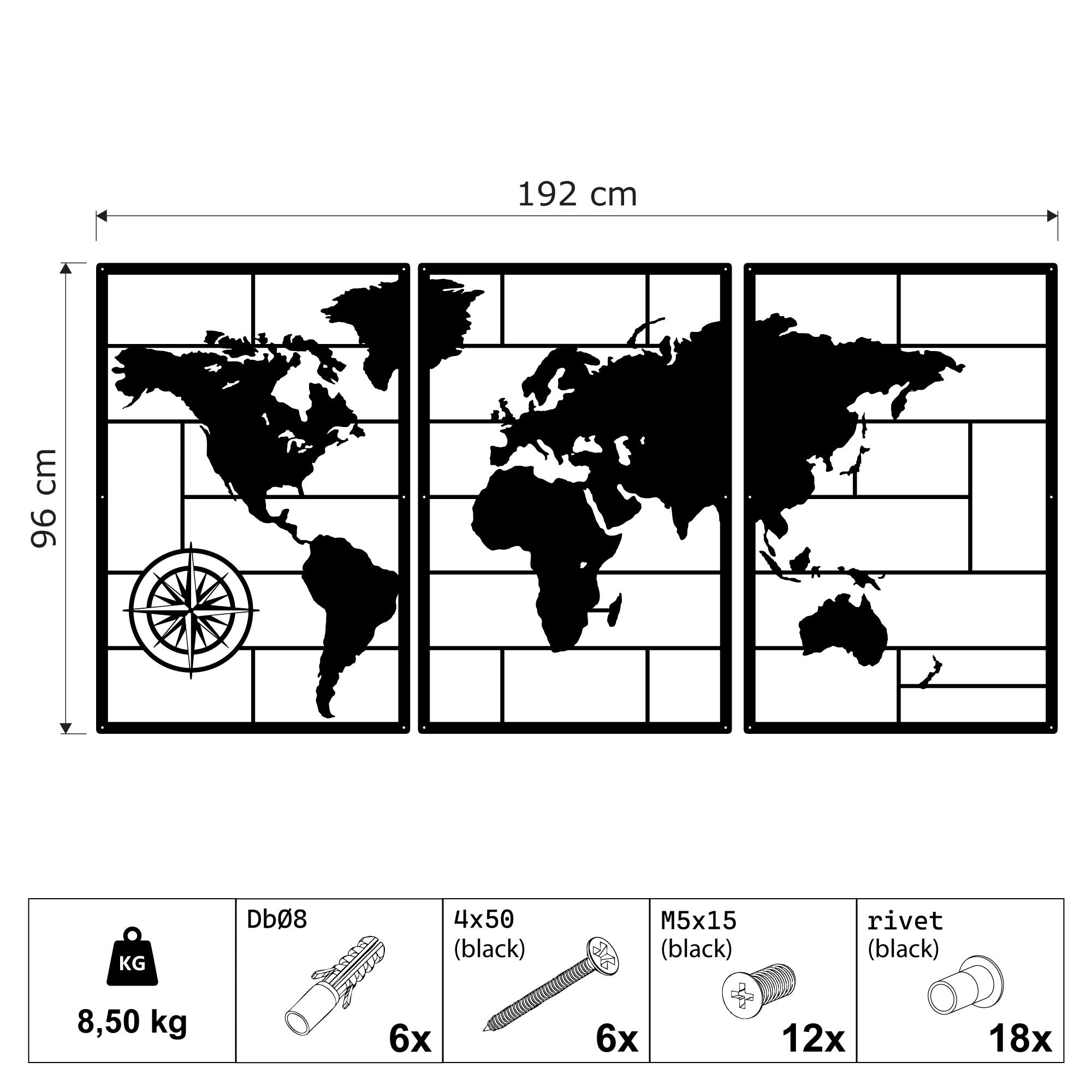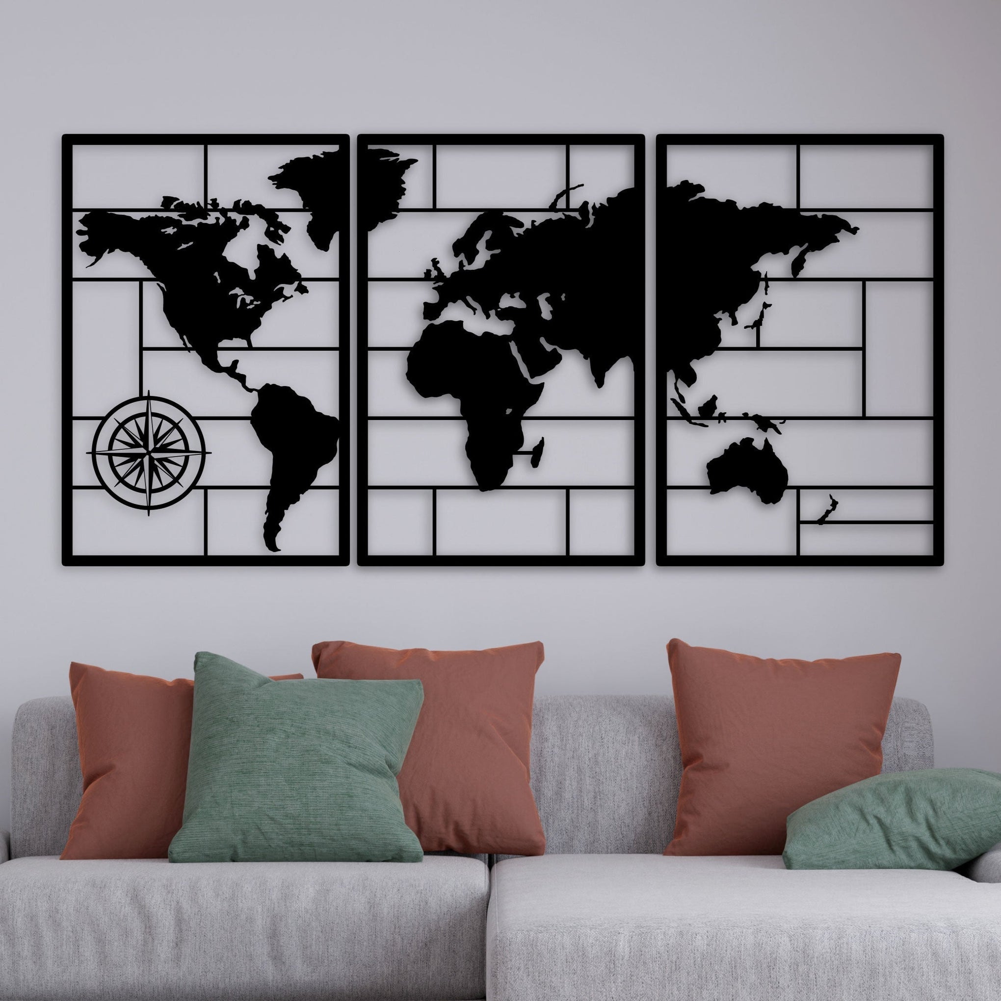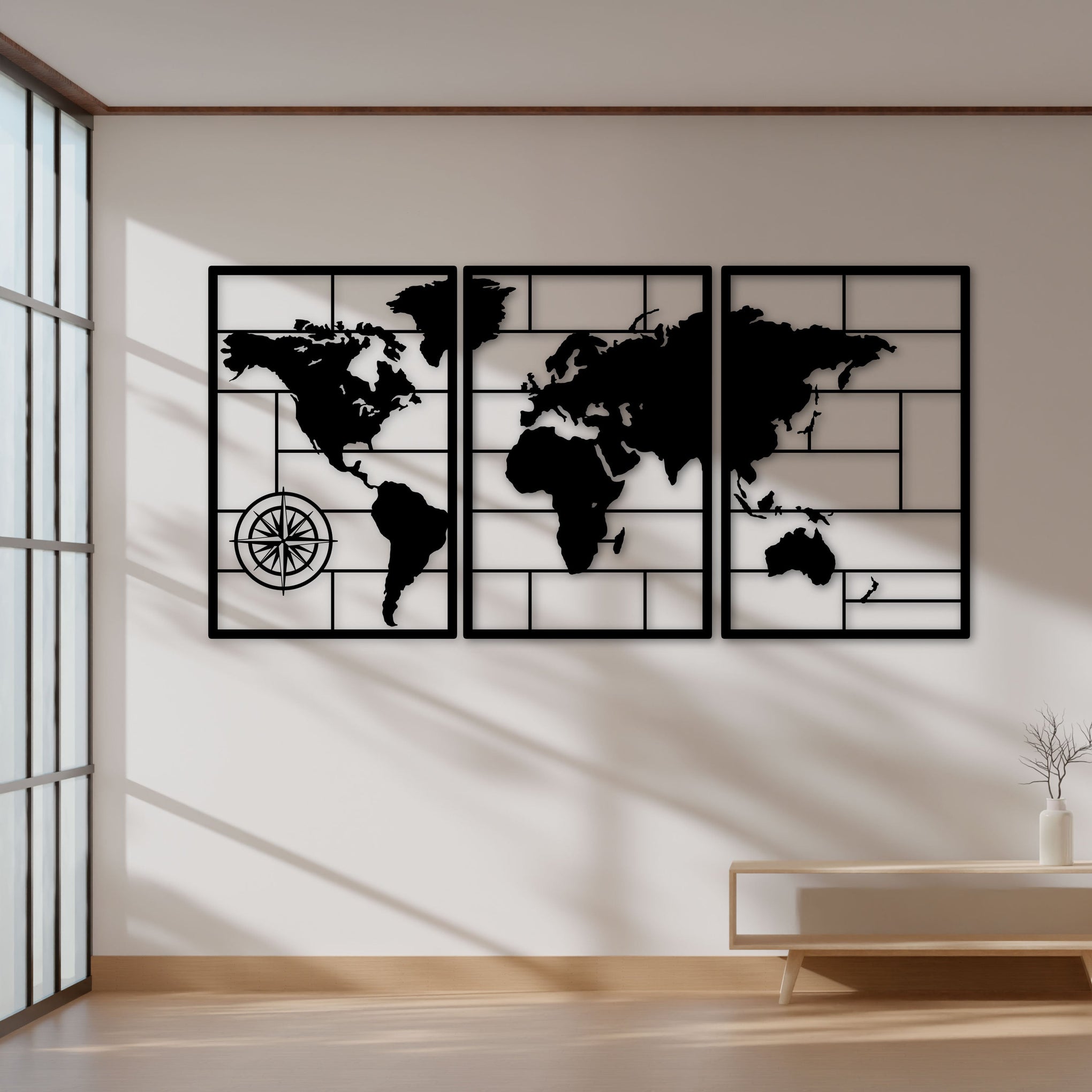 Metalen wanddecoratie | Drieluik wereldkaart | Stijlvol en modern ontwerp