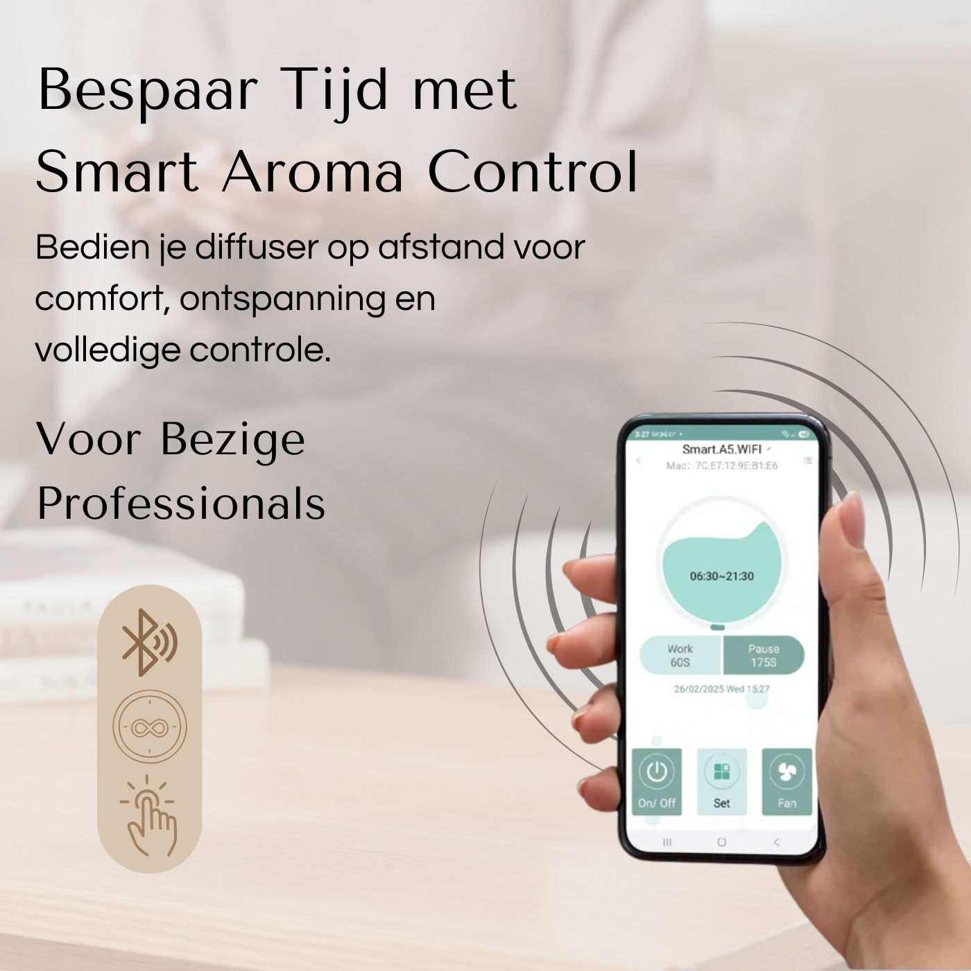 Begin met het aansluiten van je diffuser, verbind hem via Bluetooth met de app en voeg je favoriete geur toe — in enkele minuten is alles klaar en verandert je huis direct in een rustgevende, luxe omgeving.”