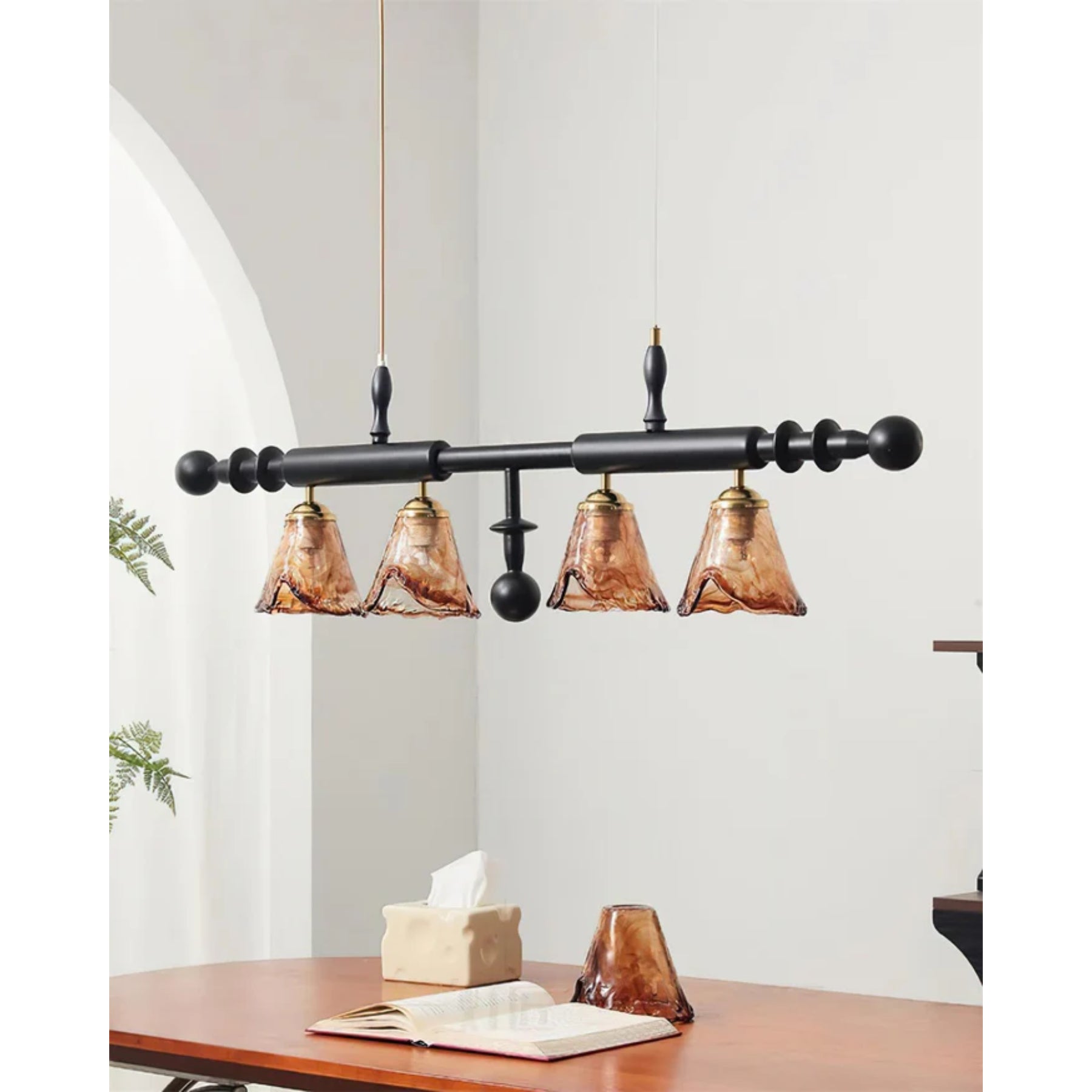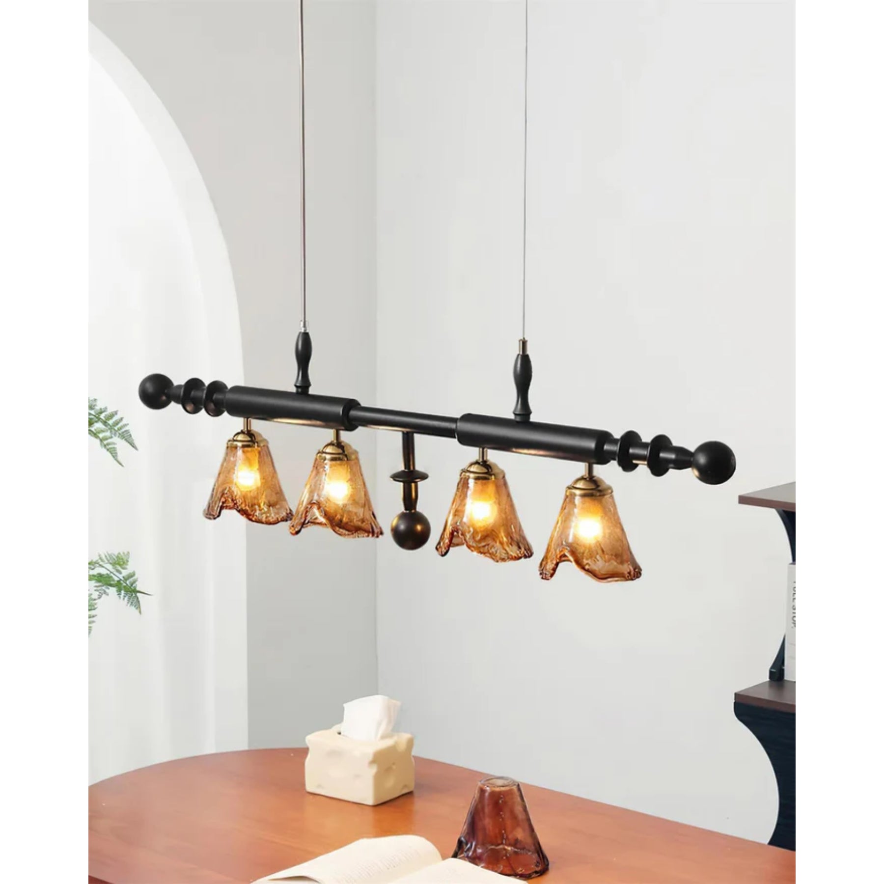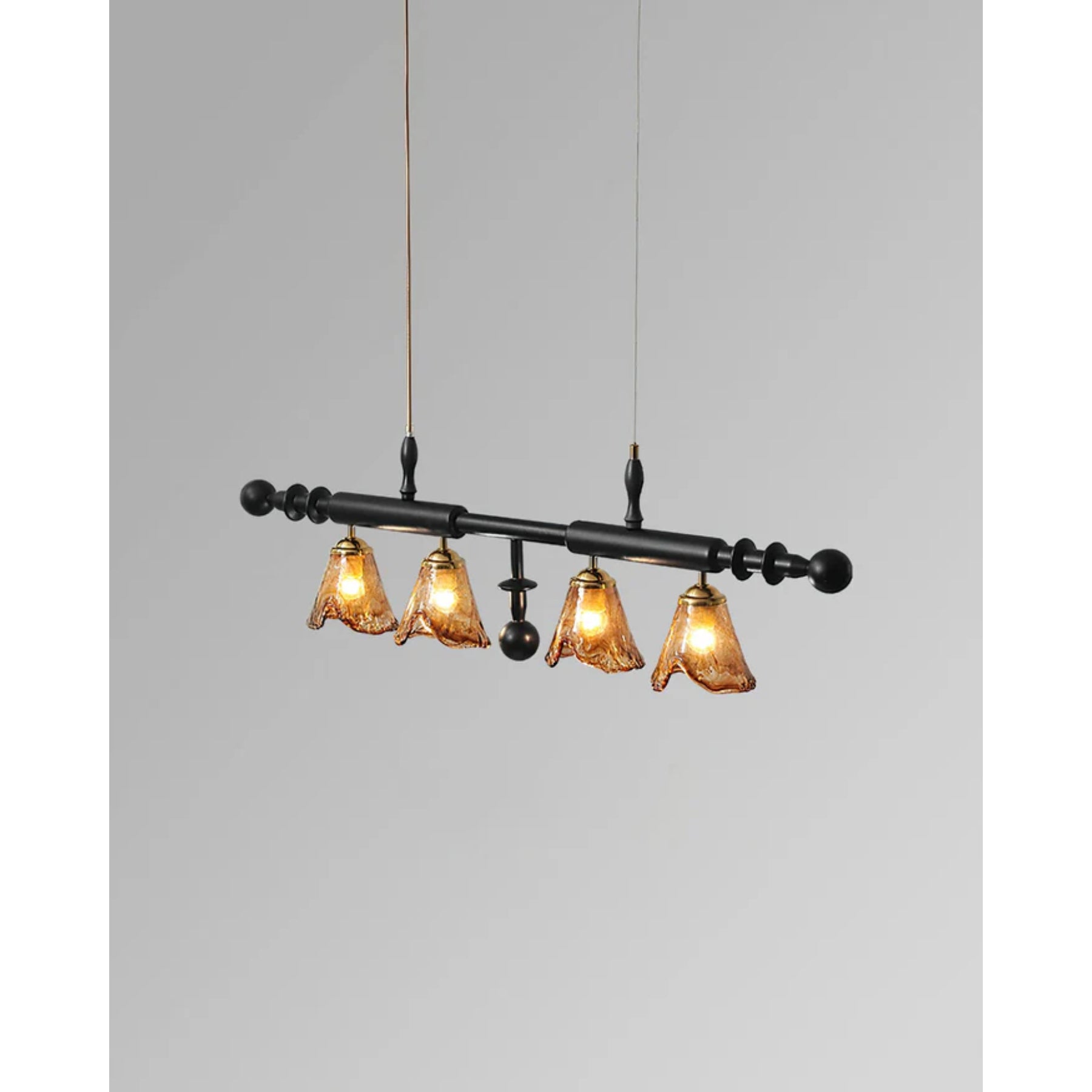 • Kappen: Vier amberkleurige glazen kappen voor een warme uitstraling.