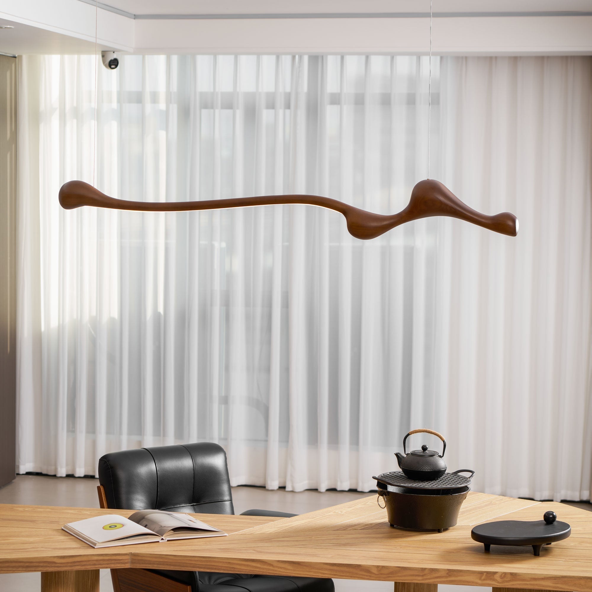 Met zijn vloeiende, organische vormen is deze hanglamp geïnspireerd door de schoonheid van de natuur. Het ontwerp, dat doet denken aan een tak of stromende rivier, creëert niet alleen een visueel statement, maar brengt ook beweging en elegantie in elke ruimte. De warme uitstraling van de combinatie van hout, metaal en acryl zorgt ervoor dat het licht op een zachte manier wordt verspreid, waardoor een gezellige sfeer ontstaat. Deze lamp is ideaal om een sfeervolle ambiance te creëren in zowel moderne als traditionele woningen, en lost de uitdaging op van het vinden van verlichting die zowel functioneel als esthetisch aantrekkelijk is.